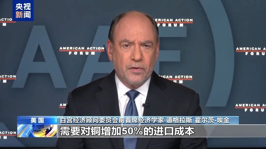白宫经济顾问委员会前首席经济学家道格拉斯·霍尔茨-埃金表示,对铜增加50%的关税能否降低国家安全的风险存疑,却会让成本升高,物价上涨,影响经济发展。