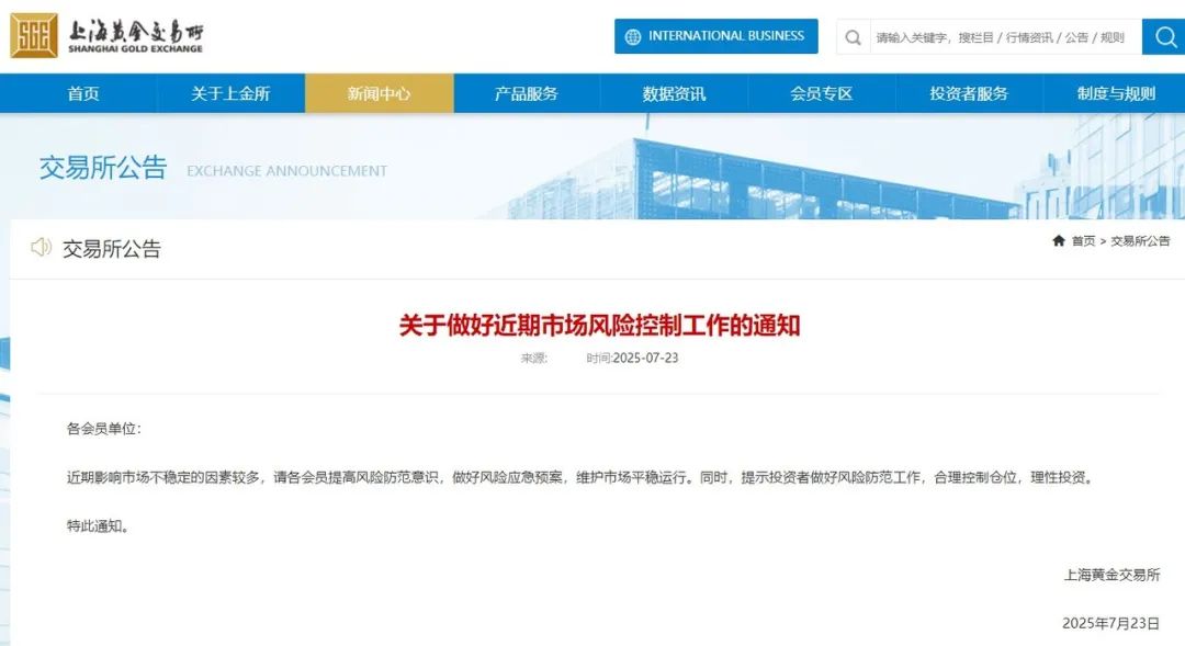 记者注意到,就在金价冲高之际,上海黄金交易所23日发布公告称,近期影响市场不稳定的因素较多,请各会员提高风险防范意识,做好风险应急预案,维护市场平稳运行。同时,提示投资者做好风险防范工作,合理控制仓位,理性投资。在此之前,上海黄金交易所已经在今年连续6次明确发布风险提示或加强风险防控的通知。