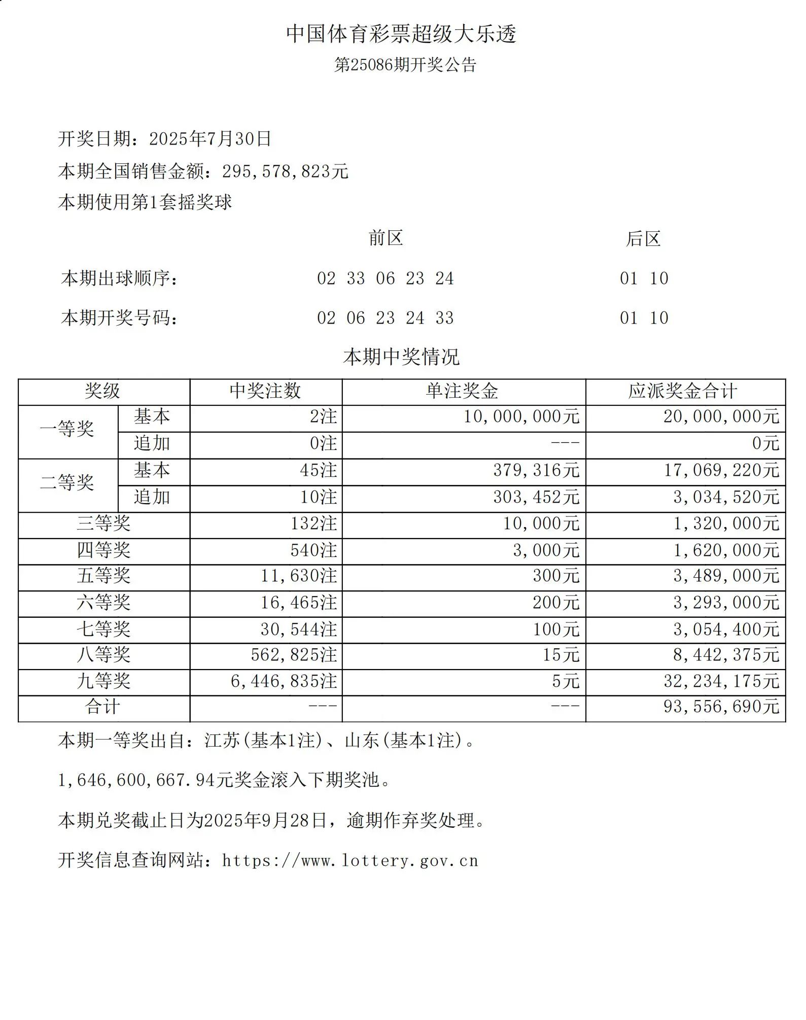【开奖公告】超级大乐透第25086期开2注一等奖