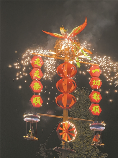 19时整,泰顺分会场的“压轴好戏”——国家级非物质文化遗产“药发木偶”表演准时上演。以火药为引、木偶为魂,腾空的木偶时而如“白鹿衔花”轻盈跳跃,时而似“瓯江潮涌”气势磅礴,烈焰与星光交织,演绎出“火树银花不夜天”的奇观——这是泰顺20场文旅特色活动的“开篇之作”。