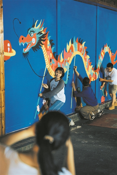 一个“接”字顶端的金元宝、“碇步龙”舞动的龙杆、被托举的生日蛋糕……温作果透露,为了提高涂鸦街区的可玩性,团队在设计时特意埋下诸多“钩子”与留白。市民也会自发发掘创意角度——或模仿画面姿势互动,或寻找独特构图,再将创意打卡照分享至社交平台,催生出源源不断的新灵感。最近市民黄先生喜欢晚上来这儿逛逛拍照,他说:“这些涂鸦又潮又有家乡味,得拍下来让更多人了解我们泰顺的文化!”