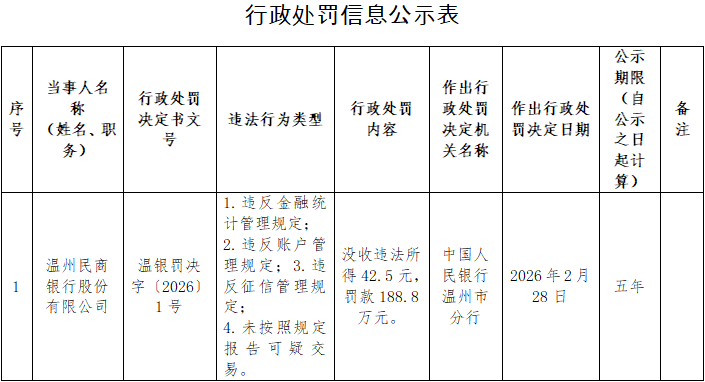 中国人民银行浙江省分行网站近日公布的中国人民银行温州市分行行政处罚信息公示表(温银罚决字〔2026〕1号)显示,温州民商银行股份有限公司违反金融统计管理规定;违反账户管理规定;违反征信管理规定;未按照规定报告可疑交易。