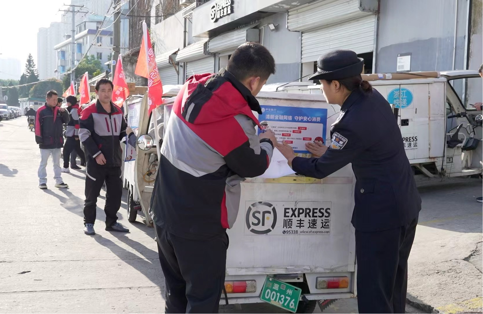 活动中,派出所警官、银行工作人员与快递员在快递车贴上反诈贴纸,悬挂起印有“清朗金融网络 守护安心消费”主题标语的宣传小旗;共同将反诈小贴士张贴包裹上;快递小车穿街走巷,成为一道流动的“金融安全风景线”,让防骗提醒随着包裹一同传递到千家万户。