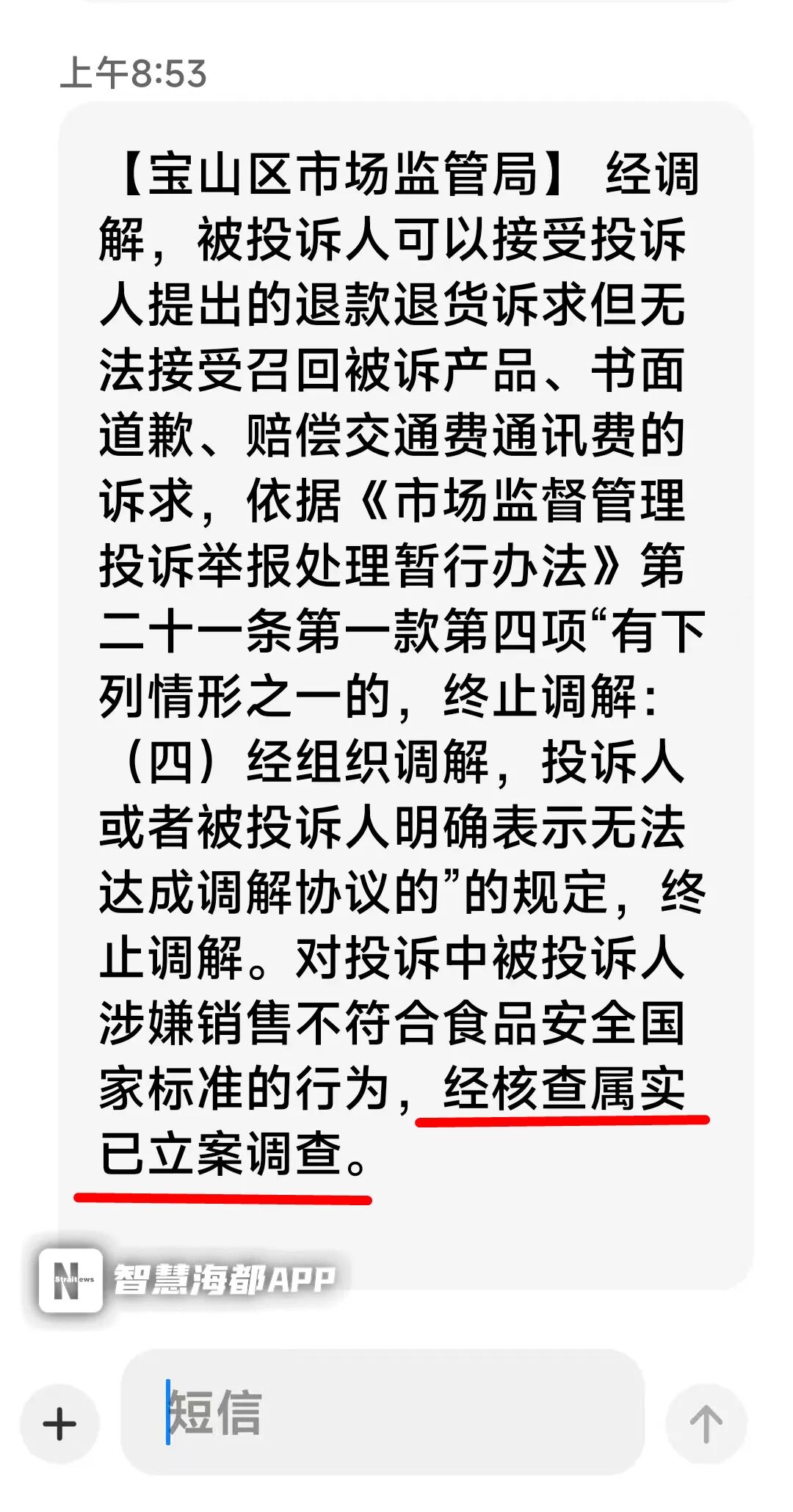 宝山区市场监督管理局短信回复潘先生说,他们接获投诉信息后,立即对山姆会员店宝山店开展现场检查,并对涉事“茗茶风味曲奇礼盒”的标签合规性、原料使用情况进行调查核实,“对投诉中被投诉人涉嫌销售不符合食品安全国家标准的行为,经核查属实已立案调查。”
