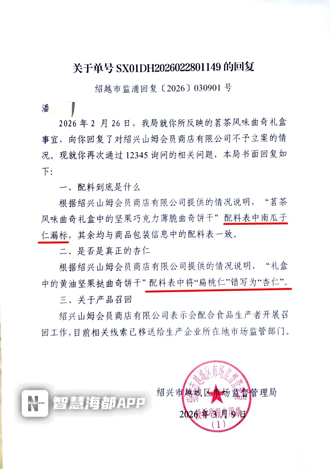 绍兴市市场监督管理局在核查后,虽作出不予立案的决定,但在核查结论中明确认定,该款曲奇礼盒存在两项与标签相关的问题,即产品外包装标注配料为杏仁,实际使用原料为扁桃仁(巴旦木仁),标示内容与实际原料不一致;产品实际添加南瓜籽仁,却未在配料表中予以标注,存在成分漏标。