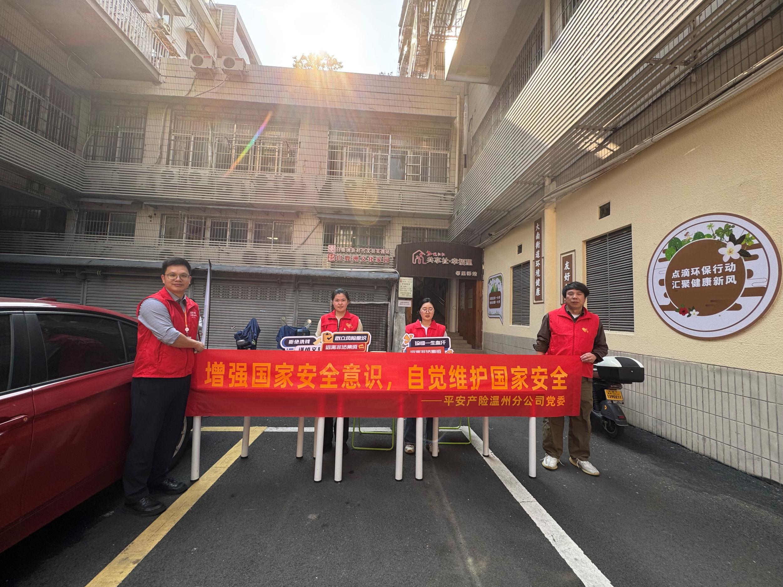 为深入贯彻落实总体国家安全观,增强全民国家安全意识和素养,推动国家安全宣传教育走深走实,在“全民国家安全教育日”来临之际,平安产险温州分公司党委组织党员先锋队走进白鹭洲社区,开展以“增强国家安全意识,自觉维护国家安全”为主题的宣传教育活动。